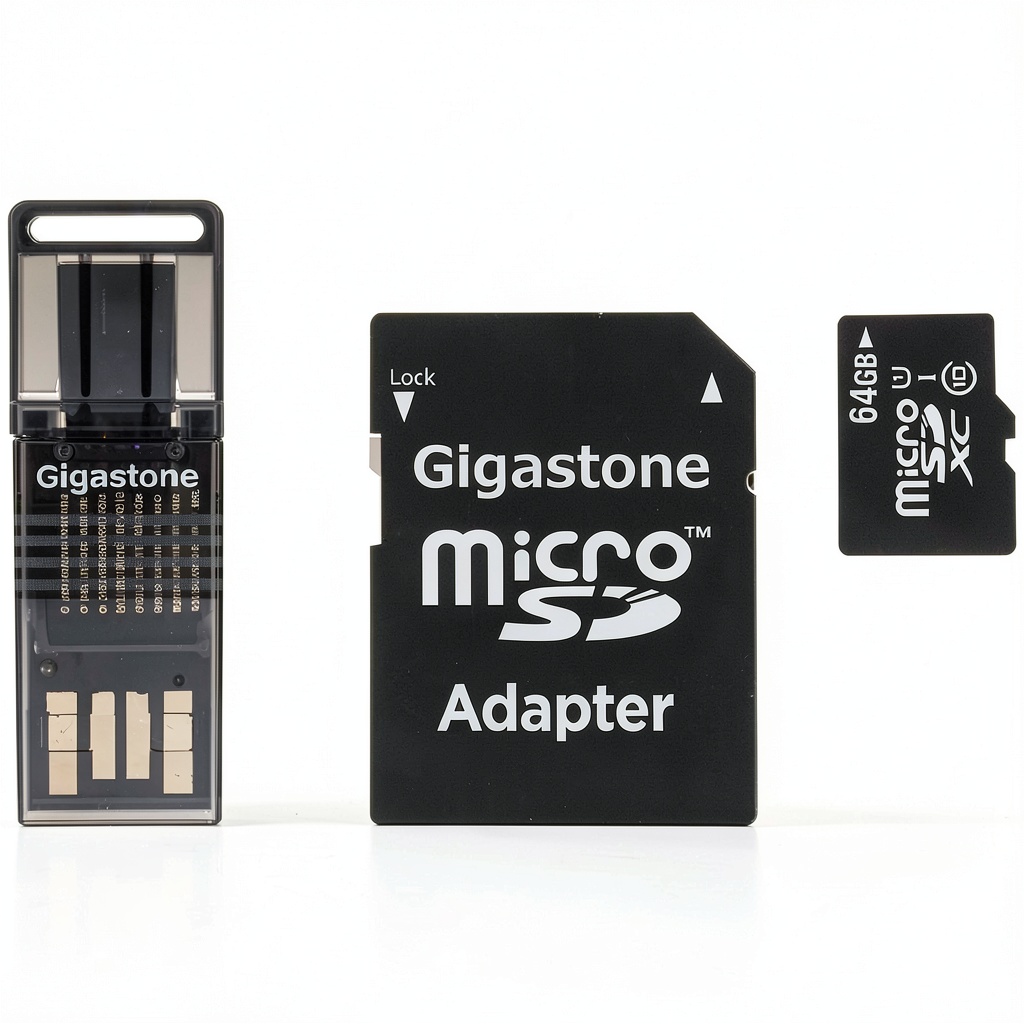 The Gigastone UHS-1 Class 10 microSD card provides 64GB of storage with transfer speeds up to 90MB/s, ensuring efficient data handling for high-resolution photos and Full HD 1080p videos. Built with robust materials, it is shockproof, waterproof, X-ray proof, and magnetic proof, offering durability in demanding environments. This 4-in-1 kit includes a microSD card, micro USB, USB, and SD adapters, supporting seamless connectivity across devices like Android smartphones, tablets, and DSLR cameras.